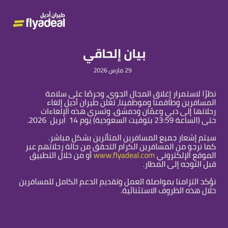 Η Flyadeal προέτρεψε τους επιβάτες να ελέγχουν την κατάσταση των πτήσεων τους μέσω της επίσημης ιστοσελίδας ή της εφαρμογής πριν κατευθυνθούν στο αεροδρόμιο, τονίζοντας τη δέσμευσή της να παρέχει πλήρη υποστήριξη κατά τη διάρκεια αυτών των εξαιρετικών περιστάσεων που επηρεάζουν τον τομέα των αερομεταφορών.